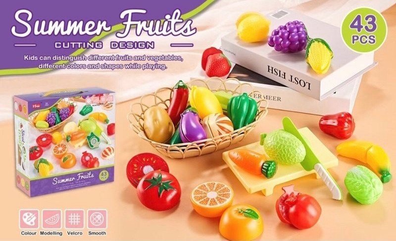 👉Bộ cắt rau củ gồm: dao, thớt và các loại củ quả như : Ngô, cà tím🍆, Cam 🍊,chuối🍌, táo🍎,nho🍇,lê🍐...