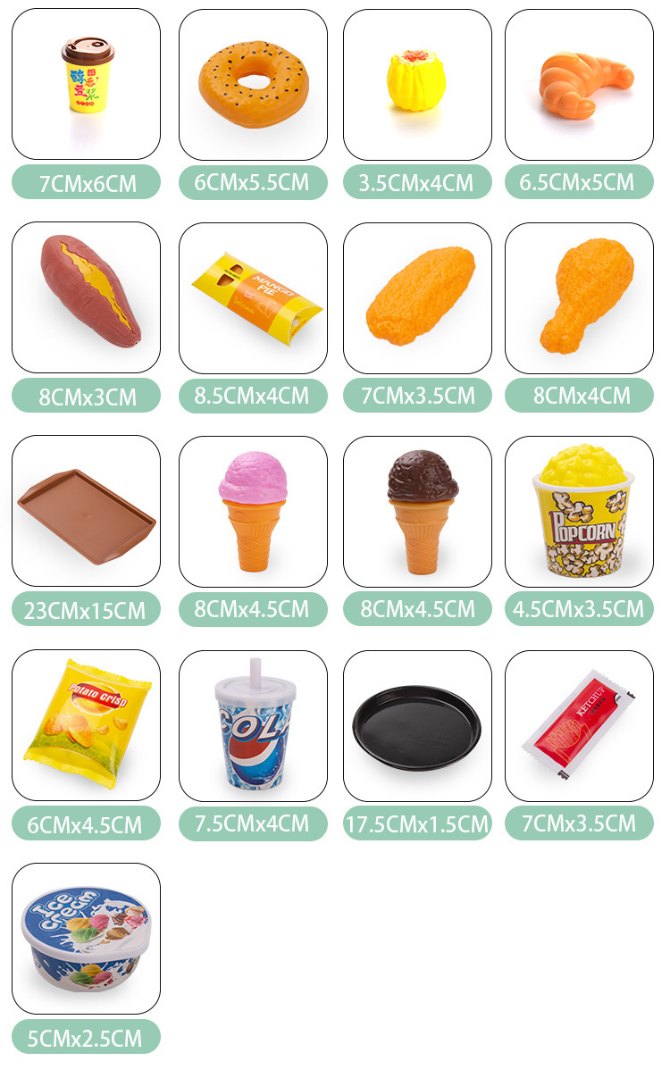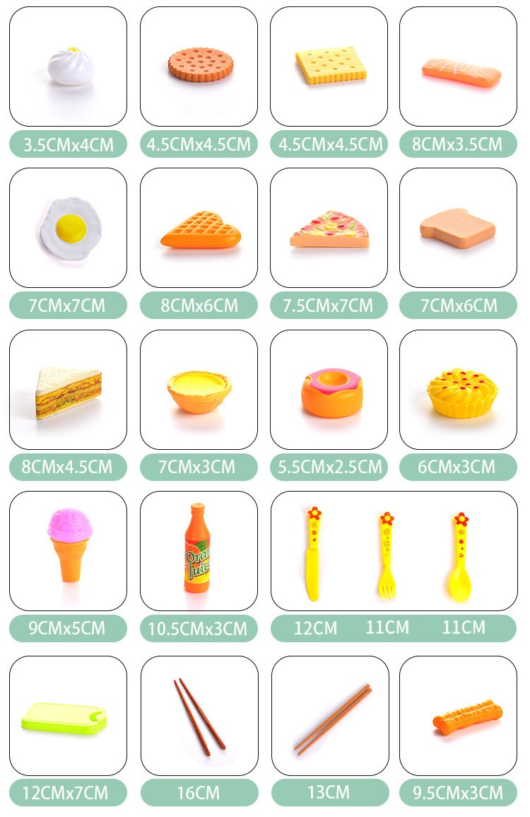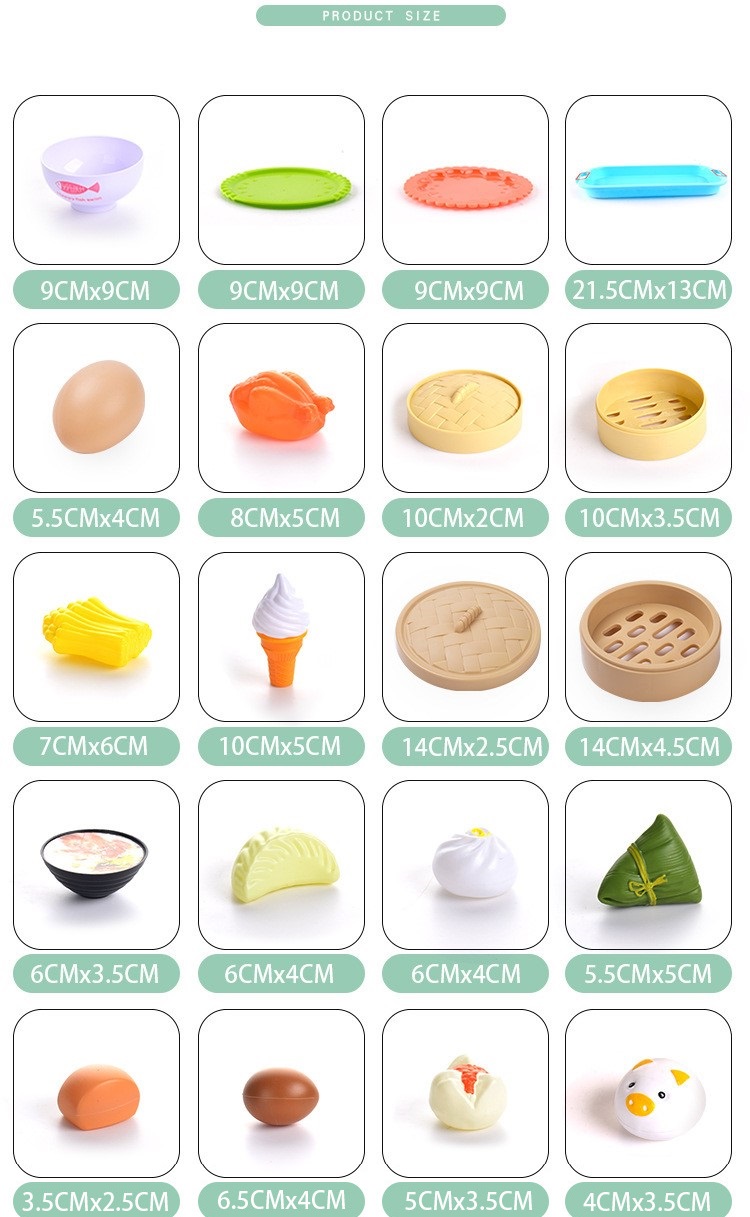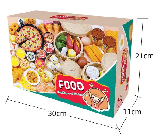 Bộ gồm 42 món: Dimsum, mì gói, khoai tây chiên, bánh giò, bánh xếp, bánh tart, kem, bánh bao hấp....tất tần tật các thể loại món ăn đồ chơi siêu cute; với các phụ kiện giỏ hấp, chén, dao, dĩa, thìa,... đi kèm.