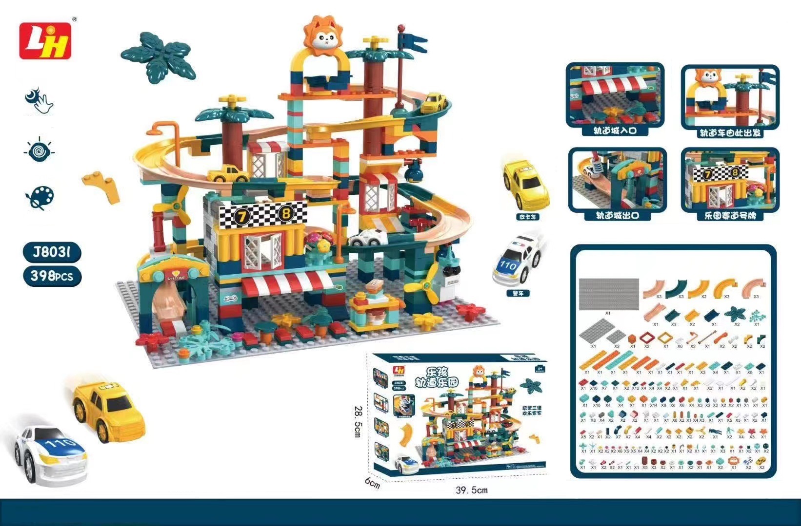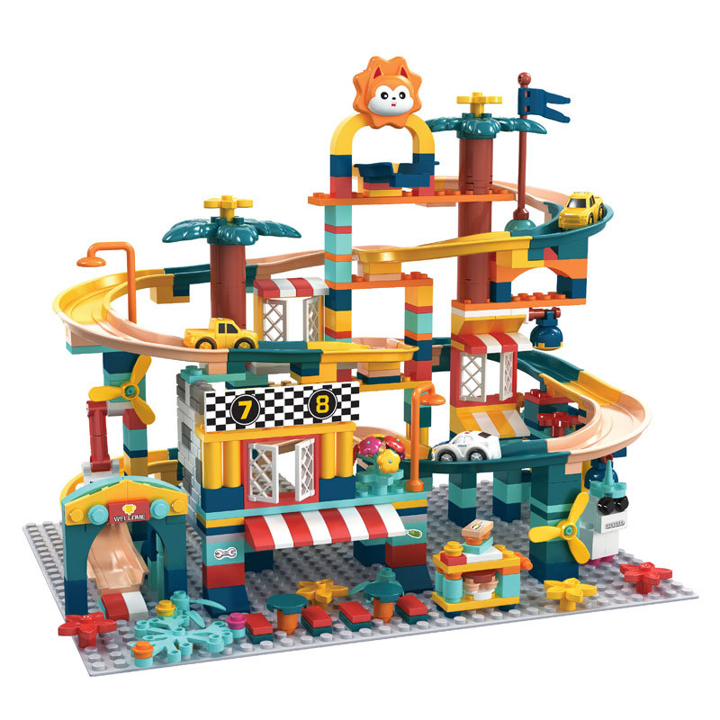 Bộ xếp hình lắp ghép cầu trượt ô tô nhiều tầng gồm 398 chi tiết, kèm xe ô tô và nhiều phụ kiện cho bé: