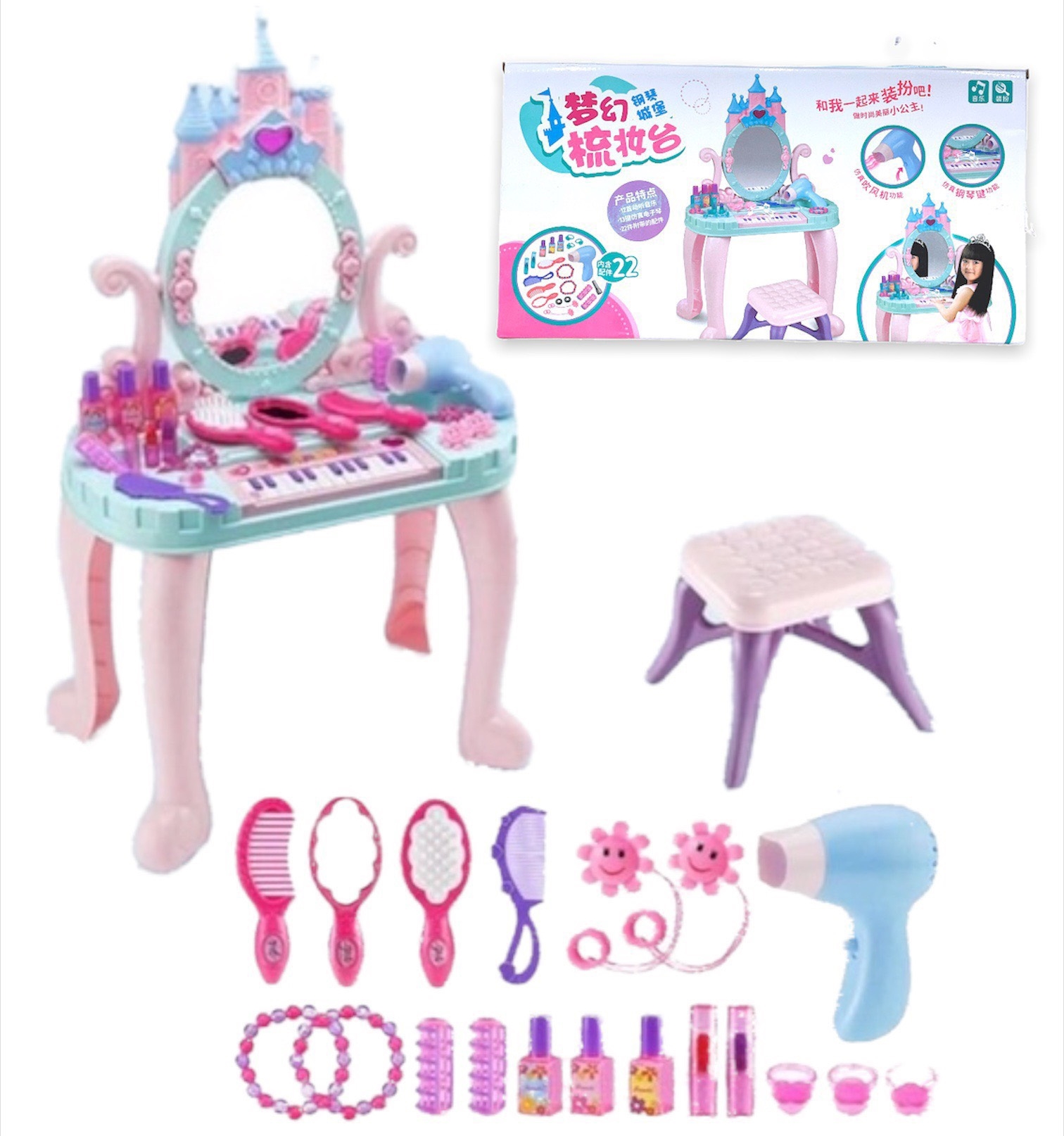 - Kèm thêm đàn piano trên bàn trang điểm, giúp bé vừa giải trí vừa học cách trang điểm, làm đẹp