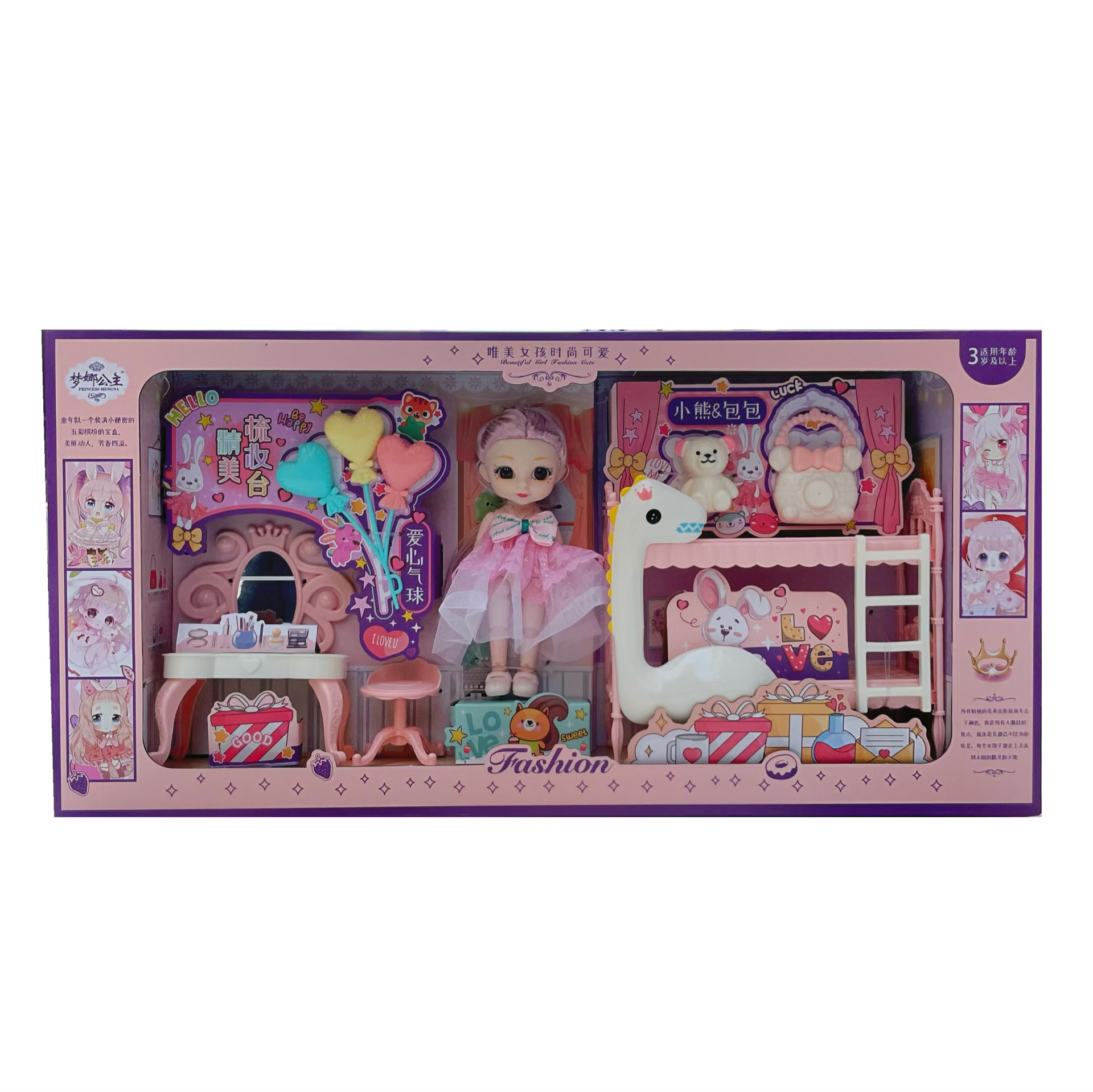 Đồ chơi búp bê cùng bàn trang điểm, giường tầng hươu cao cổ và các phụ kiện cho bé: