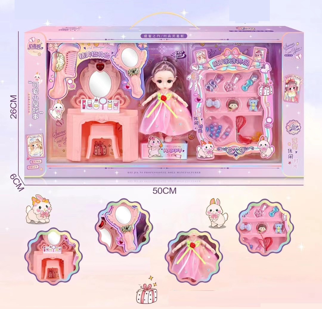 Đồ chơi búp bê cùng bàn trang điểm và các dụng cụ làm đẹp cho bé: