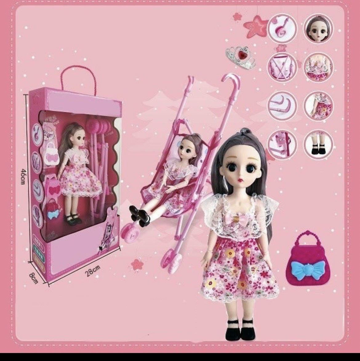 Đồ chơi búp bê kèm xe đẩy em bé màu hồng cho bé: