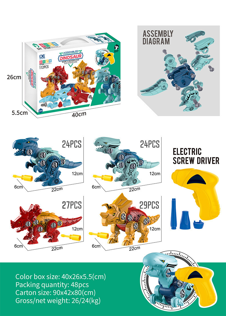 Đồ chơi khủng long lắp ráp bằng vít, kèm máy vặn vít với 4 mẫu khủng long cho bé: