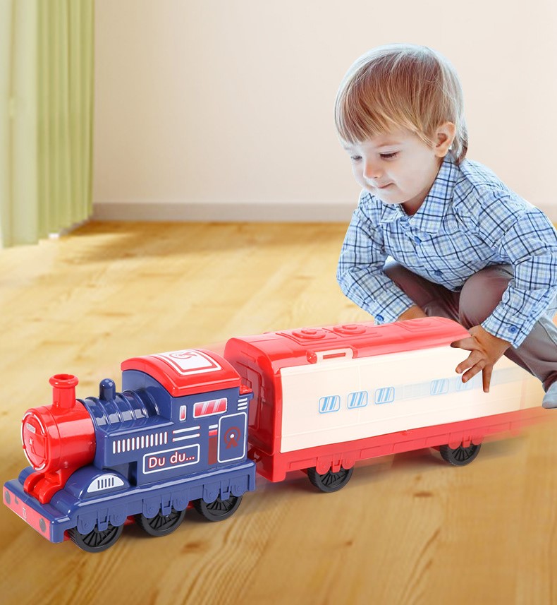- Bên cạnh bộ xe lửa chạy ray, bé còn có một đầu tàu mô hình chạy bằng trớn cỡ lớn; có thể chứa các toa nhỏ trong đầu