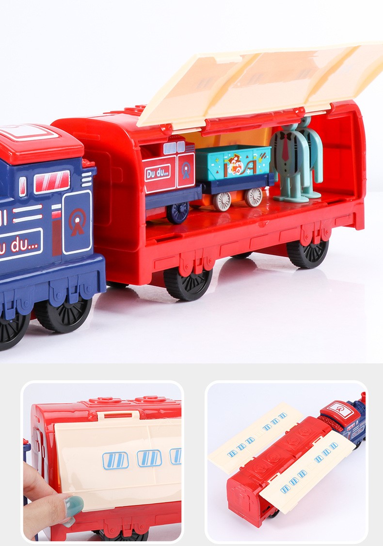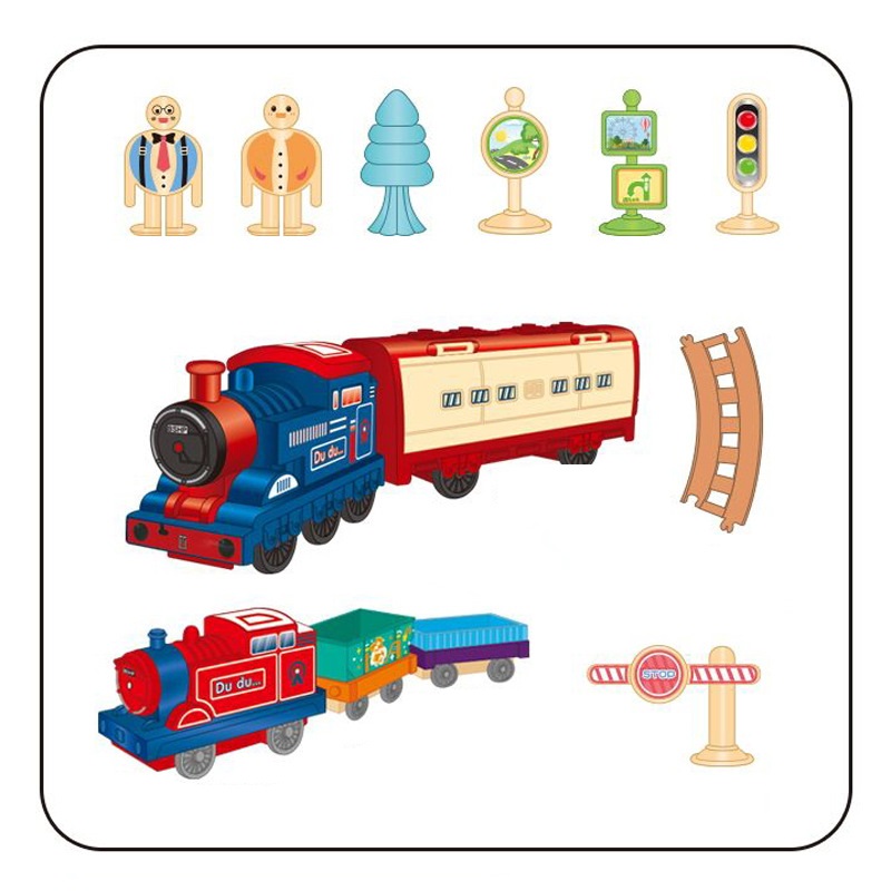 Đồ chơi lắp ghép đoàn tàu xe lửa chạy trên đường ray gồm 3 toa tàu nhỏ chạy pin và 1 đầu tàu lớn cho bé: