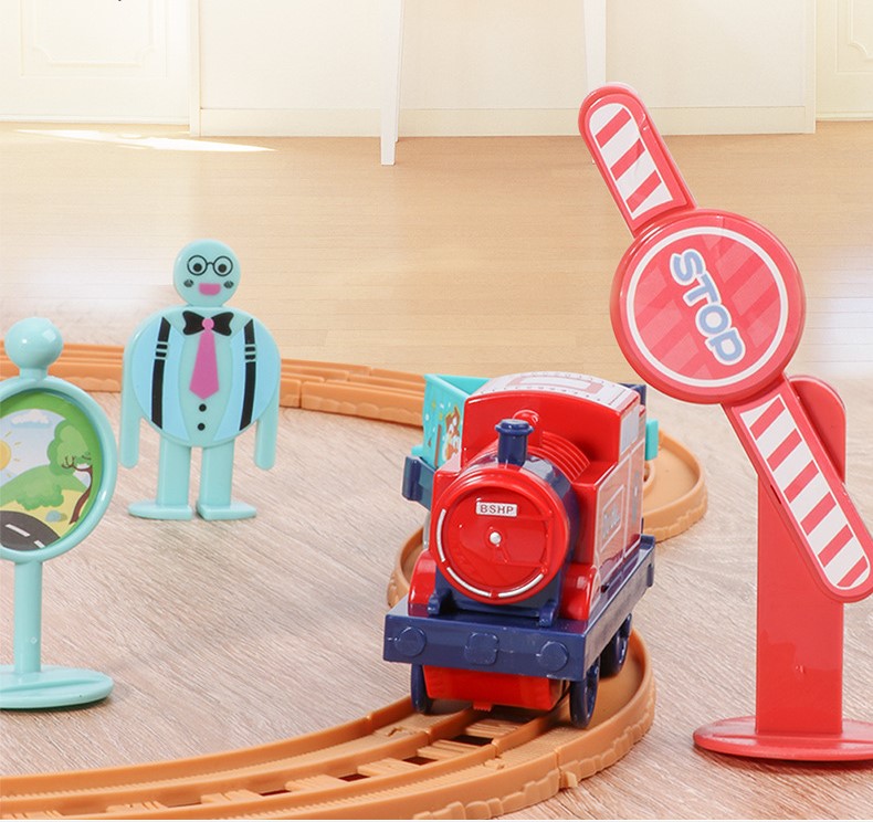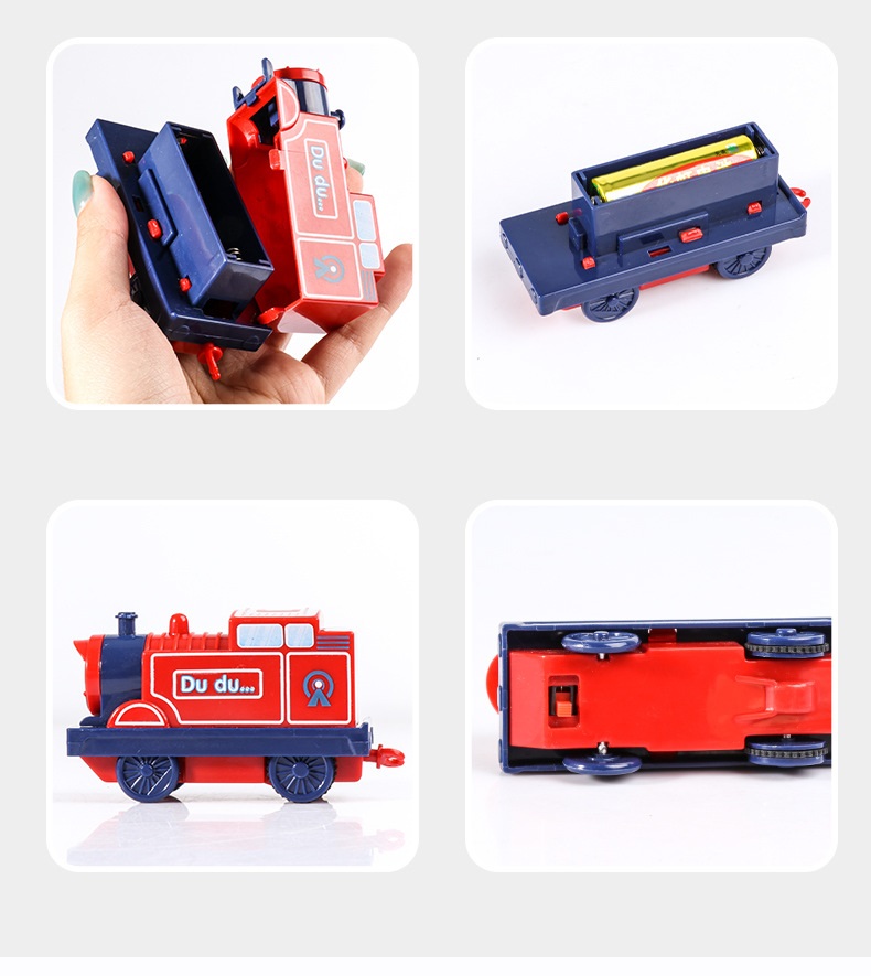 – Đầu tàu chạy bằng pin trên đường ray. Bé có thể sáng tạo các kiểu đường ray khác nhau khi chơi.