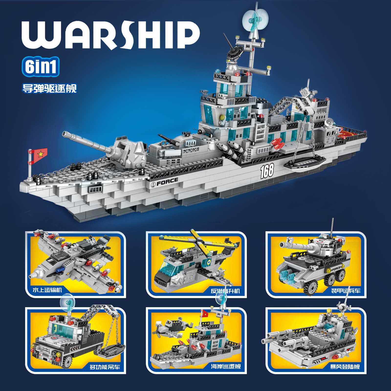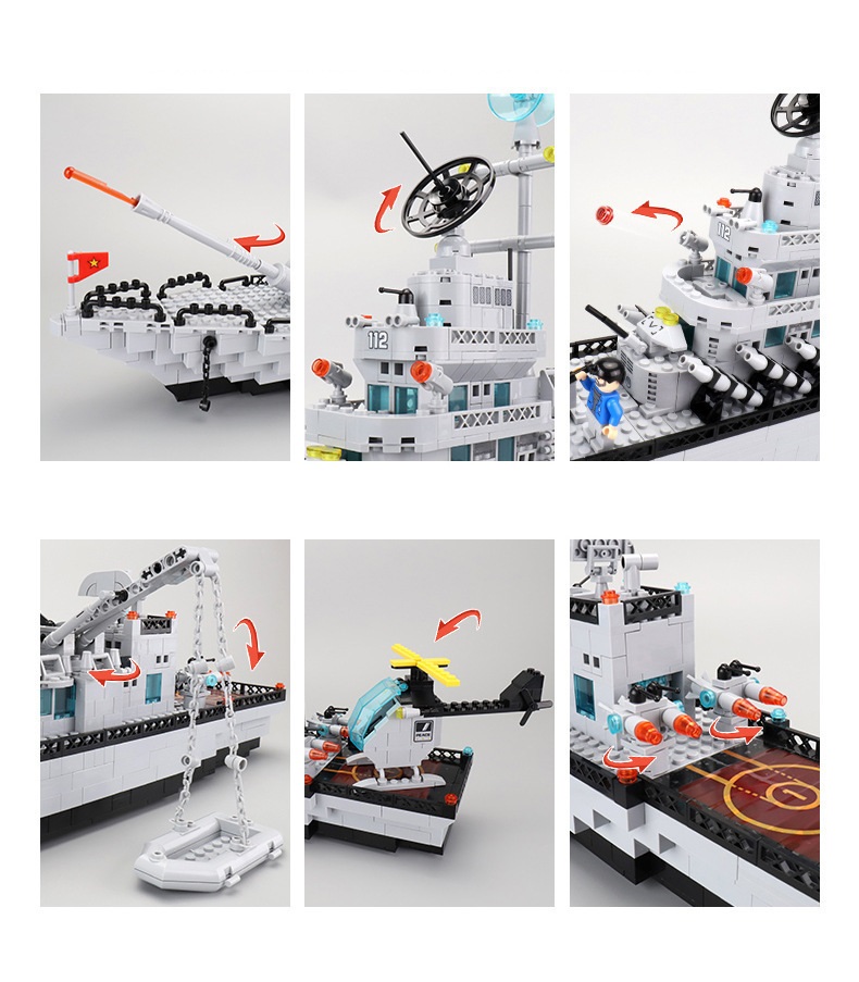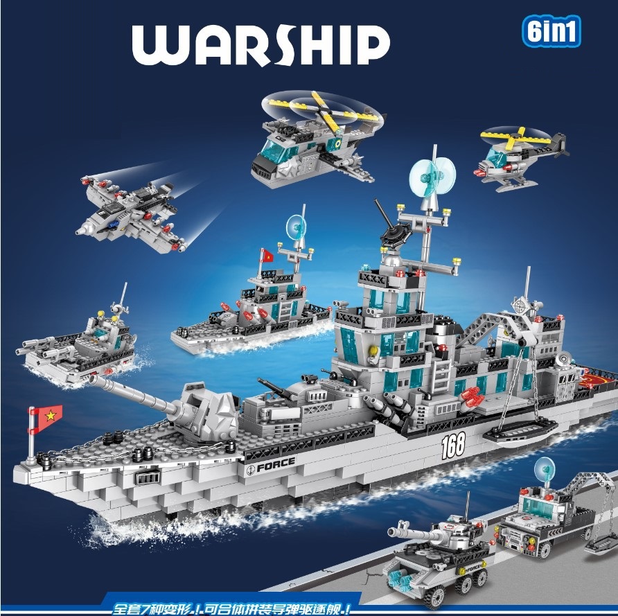 Đồ chơi lắp ghép xếp hình tàu chiến đấu cao cấp cỡ lớn 6 trong 1 kèm trực thăng, tàu nhỏ và các nhân vật thủy thủ với 1416 mảnh ghép: