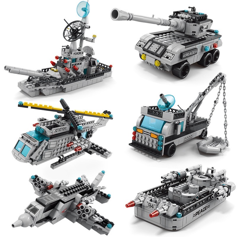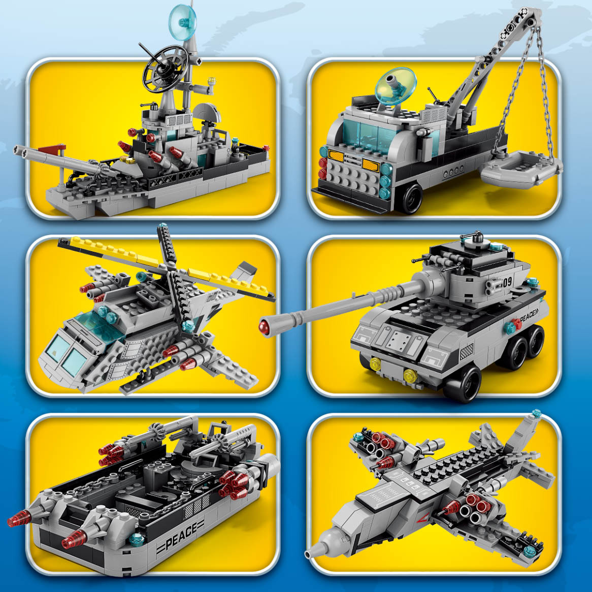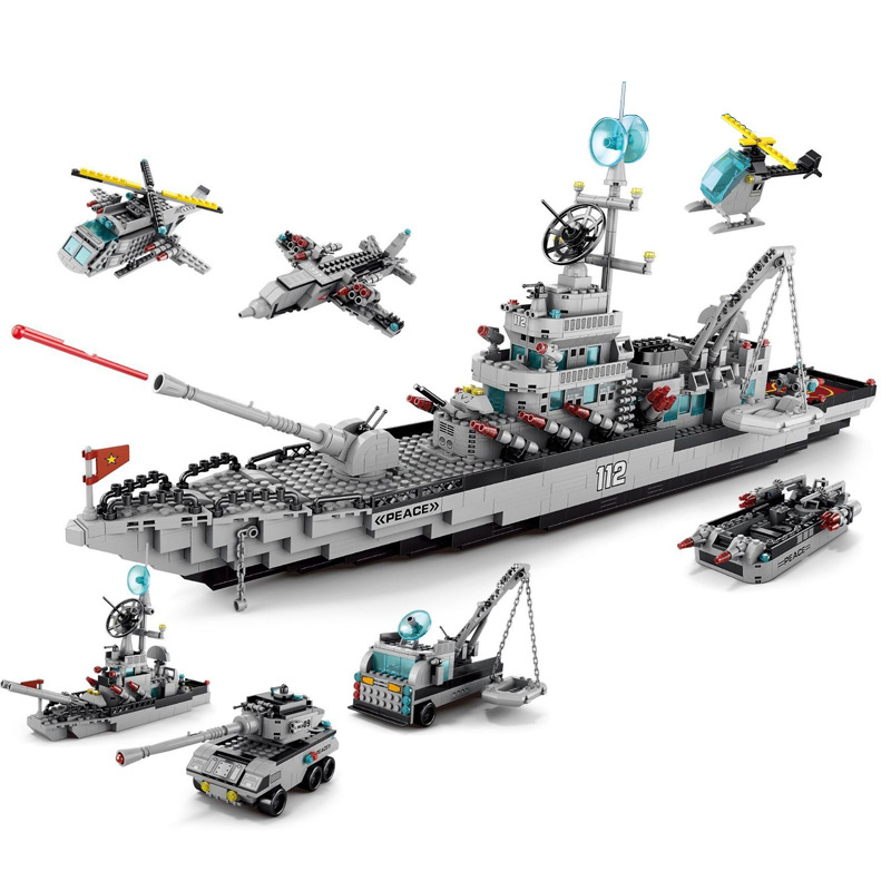 Đồ chơi lắp ghép xếp hình tàu chiến đấu cao cấp cỡ lớn 6 trong 1 kèm trực thăng, tàu nhỏ và các nhân vật thủy thủ với 1442 mảnh ghép: