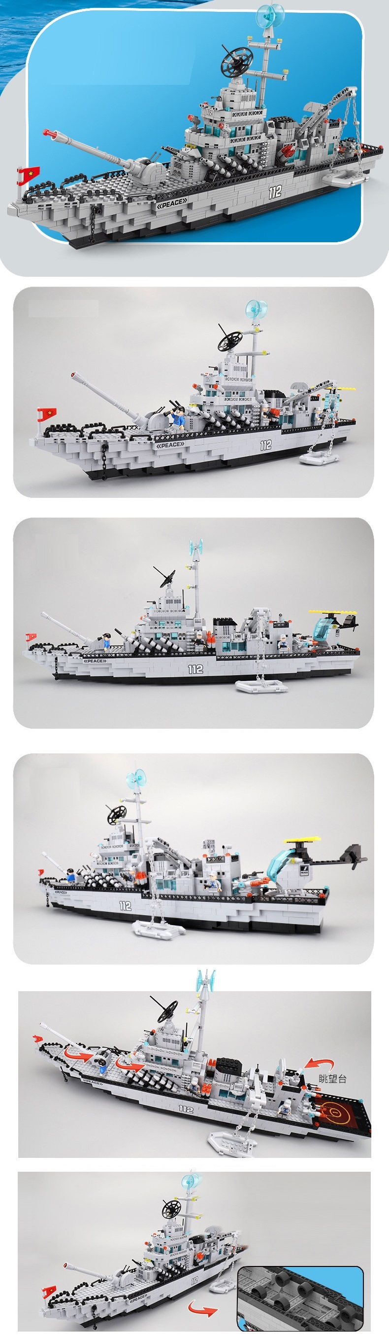 Đồ chơi lắp ghép xếp hình tàu chiến đấu cao cấp cỡ lớn 6 trong 1 kèm trực thăng, tàu nhỏ và các nhân vật thủy thủ với 1560 mảnh ghép: