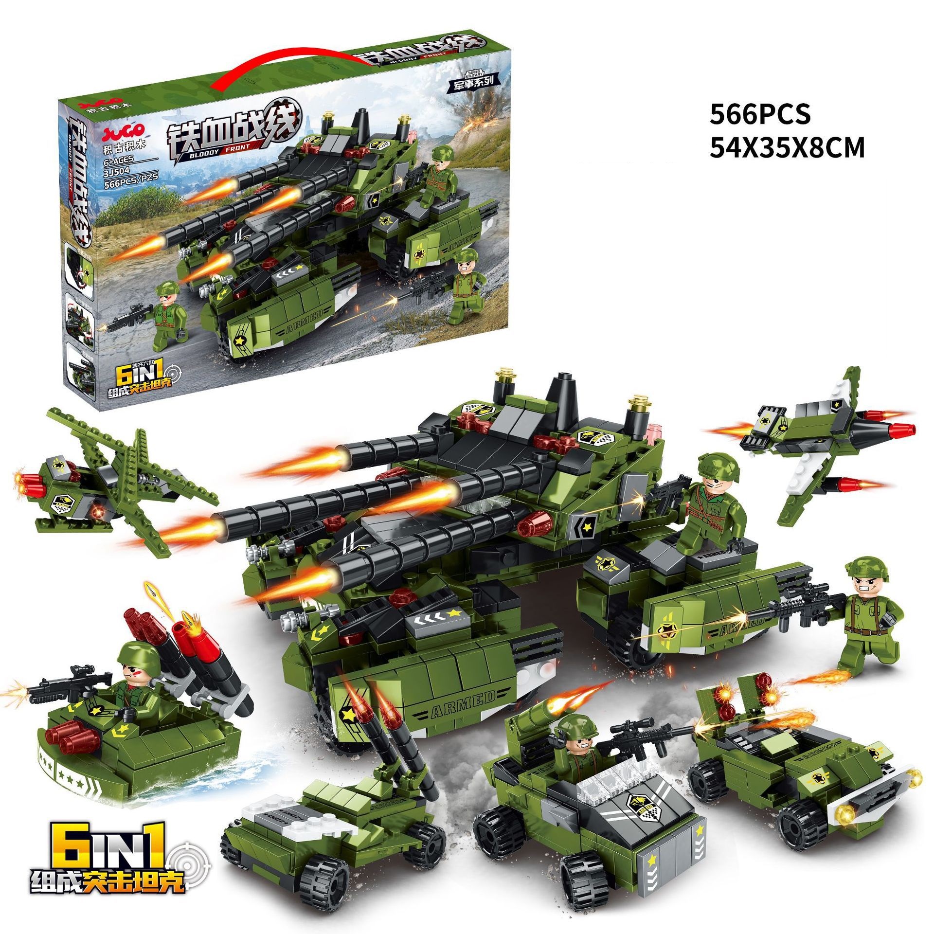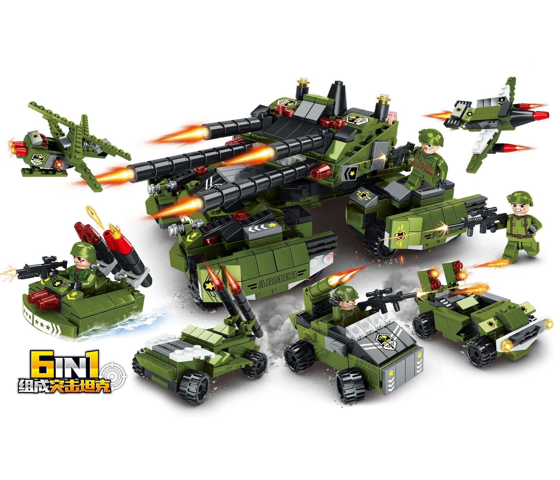 Đồ chơi lắp ghép xếp hình xe tăng nhiều nòng pháo kèm các xe nhỏ 6 trong 1 với 566 chi tiết: