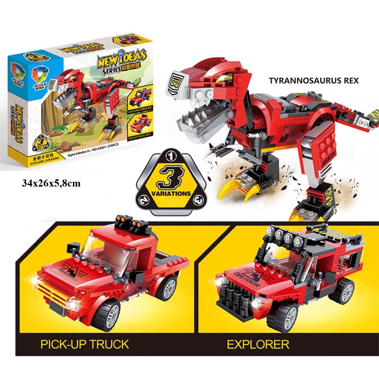 - Mẫu lắp ghép 3 trong 1: bé có thể sáng tạo xếp thành xe bán tải, xe thám hiểm rừng xanh hoặc mô hình khủng long T-Rex