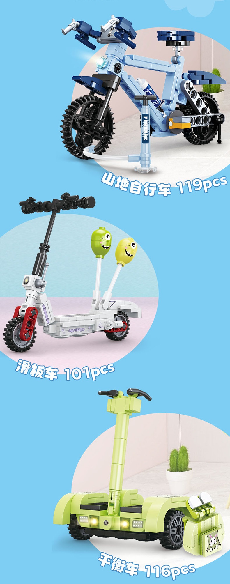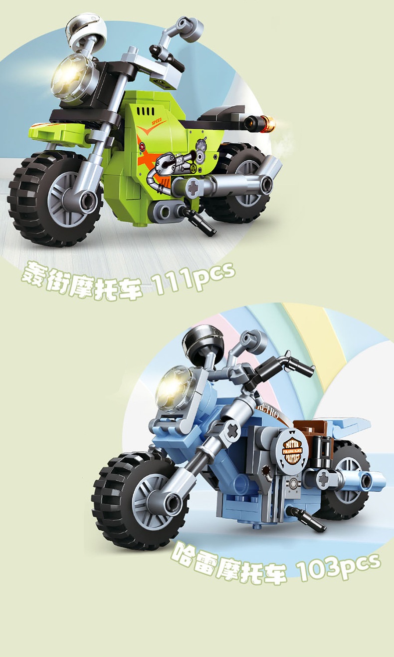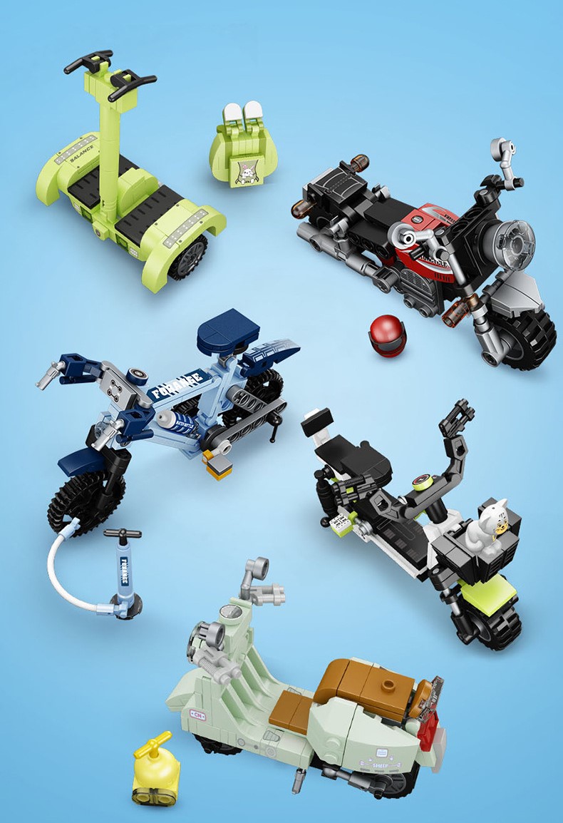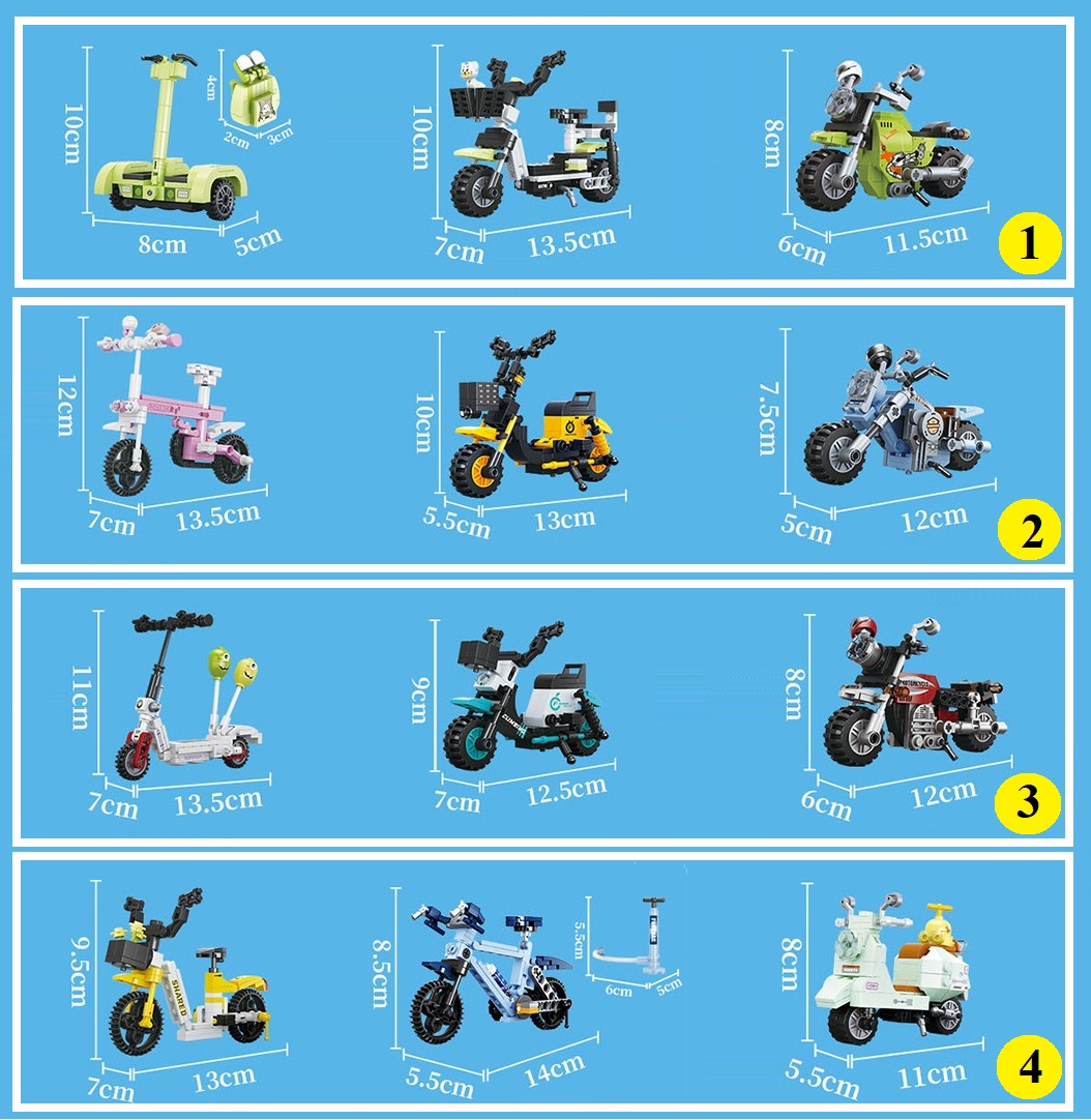 Đồ chơi lắp ghép xếp hình xe các loại: xe điện, xe scooter, xe máy từ 102 đến 130 chi tiết: