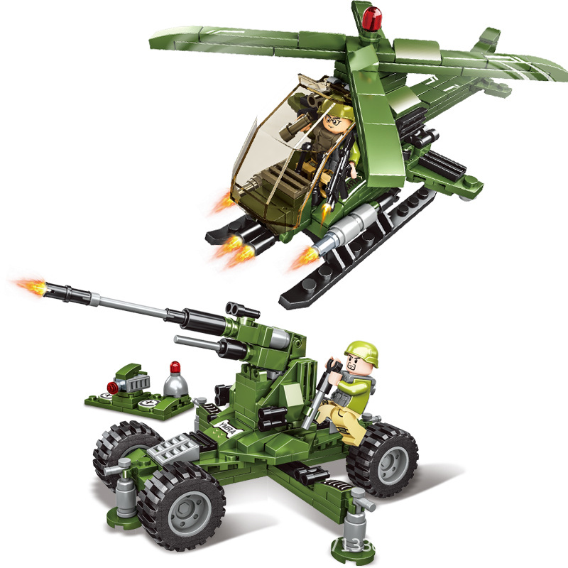 - Mẫu lắp ghép có 4 mẫu nhỏ như pháo, xe tăng nhỏ, trực thăng, xe jeep