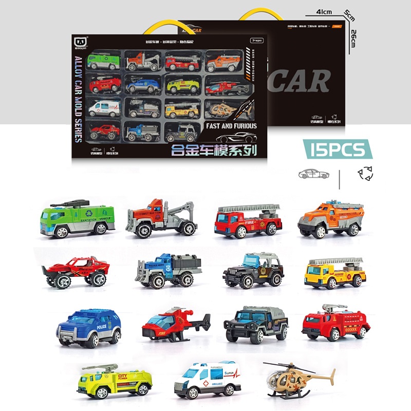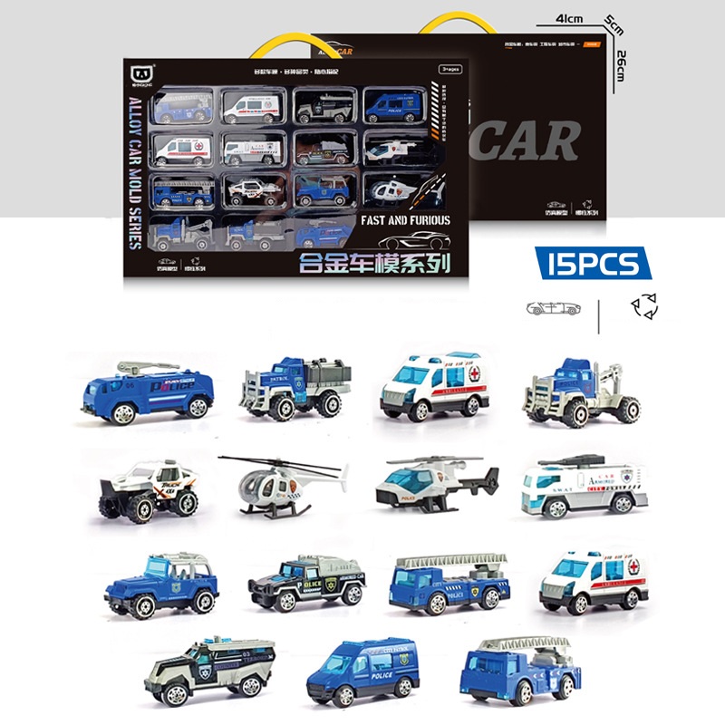 Đồ chơi mô hình 15 xe hợp kim đủ chủ đề cứu hỏa, cứu hộ, cảnh sát, cứu thương cho bé: