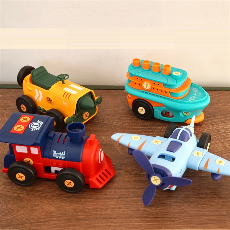 Đồ chơi mô hình 4 trong 1 gồm xe ô tô, tàu hỏa, xe máy bay, xe máy cày có thể tháo lắp được cho bé: