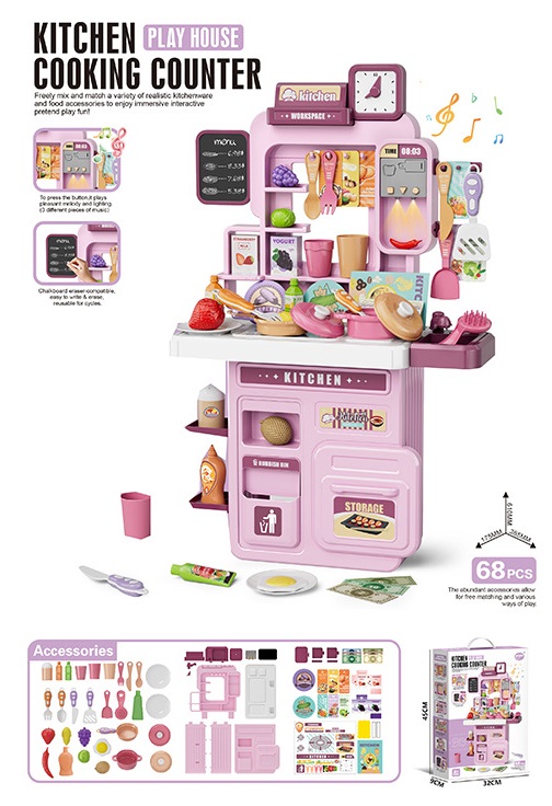 Đồ chơi mô hình nhà bếp 68 chi tiết với các đồ dùng nấu ăn, bếp...kèm hiệu ứng đèn nhạc cho bé khi chơi: