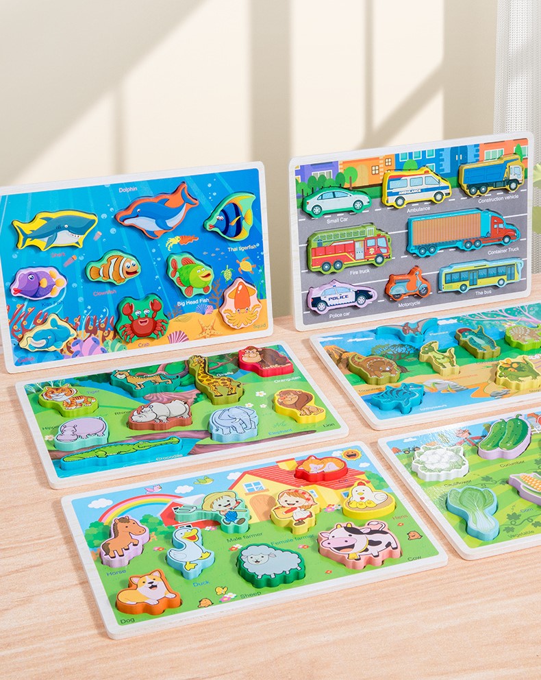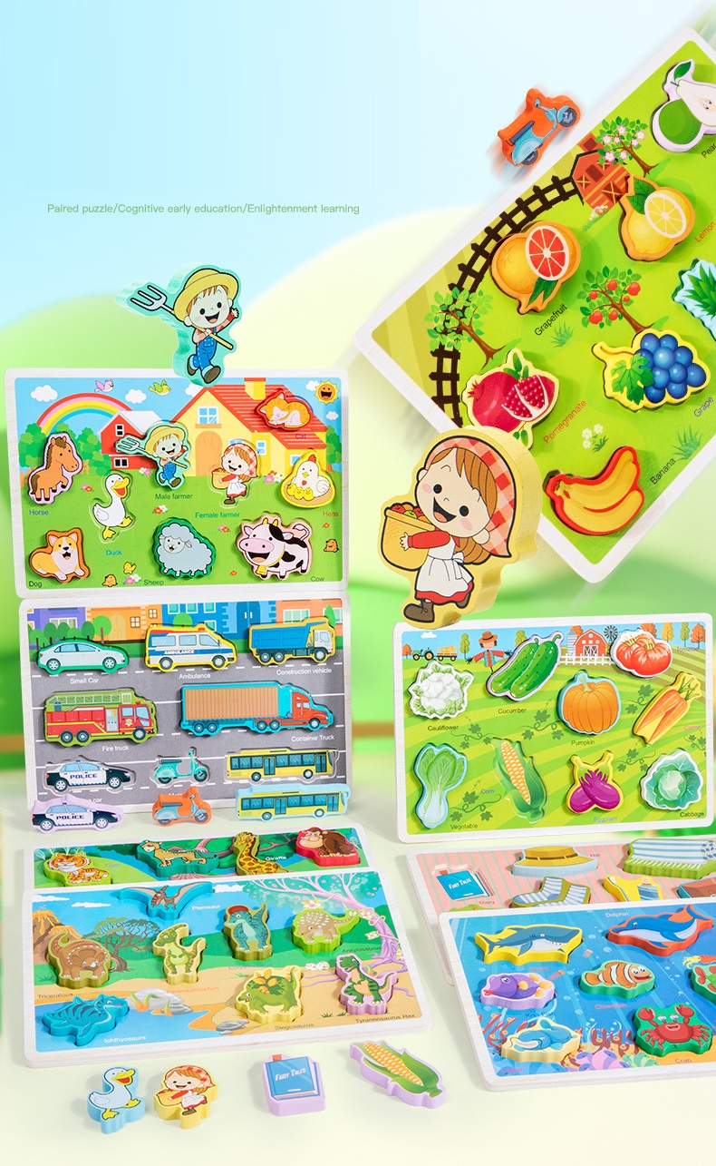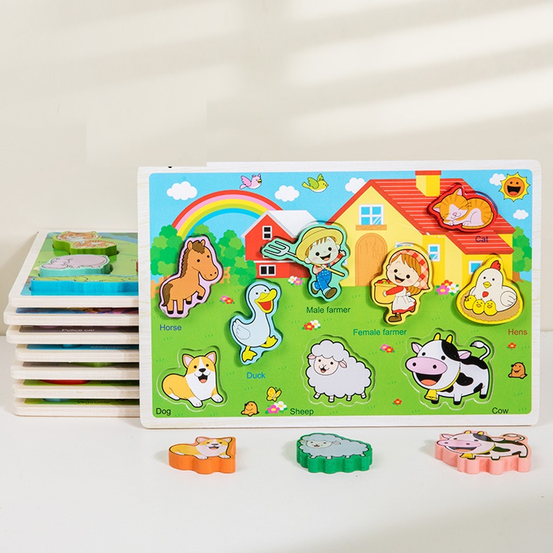 Đồ chơi tranh gỗ ghép 3D theo chủ đề kèm chữ cái tiếng anh, làm bằng gỗ thông an toàn cho bé: