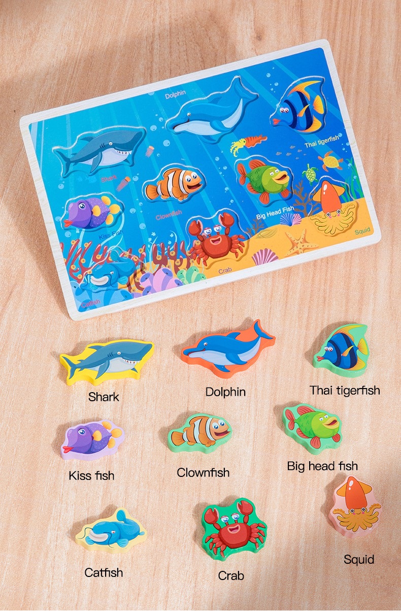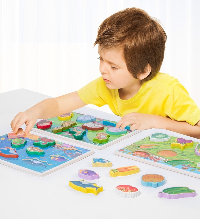 - Đồ chơi gỗ tranh ghép hình với hình các con vật, xe cộ ngộ nghĩnh với màu sắc sinh động thu hút sự chú ý, phát triển các giác quan và tư duy logic của bé.