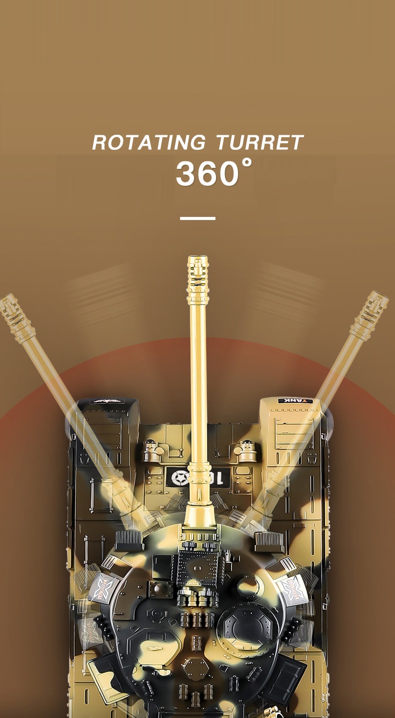 - Mô hình xe tăng với thiết kế giống như xe tăng thật, có tháp pháo xoay di chuyển linh hoạt 360 độ- nâng hạ lên xuống và đèn còi vui nhộn cho bé khám phá