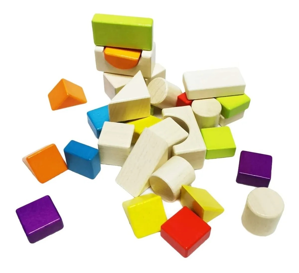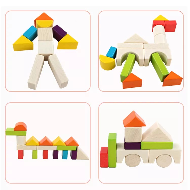 - Bộ đồ chơi gỗ xếp hình khối có 30 chi tiết với nhiều dạng hình khối khác nhau như khối vuông, khối hộp chữ nhật, tam giác, hình trụ... cùng với nhiều màu sắc đơn giản nhưng bắt mắt kích thích thị giác bé.