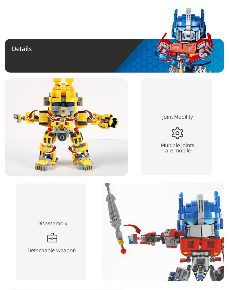 Với thế giới Transformer, bé có thể xây dựng mô hình Bumbelee vàng trựo thủ đăc lực của Optimus Prime của mình, cùng với thanh kiếm trên tay cùng nhau đi khám phá các hành tinh và bảo vệ trái đất trước sự xâm lăng của binh đoàn robot khác.