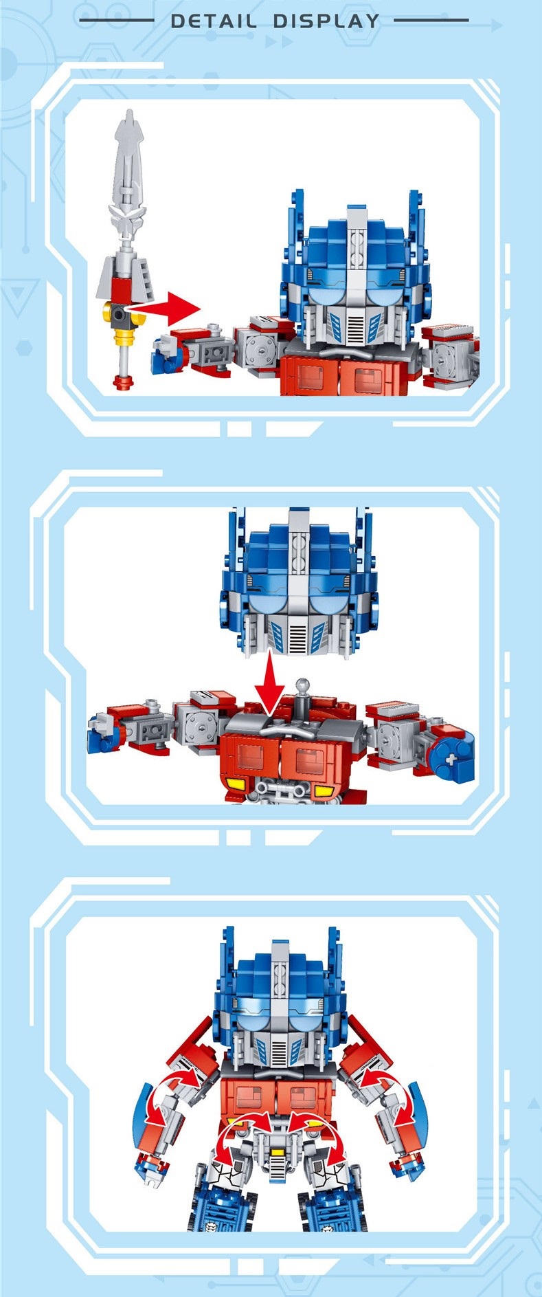 Với thế giới Transformer, bé có thể xây dựng mô hình thủ lĩnh Optimus Prime xanh của mình, cùng với thanh kiếm trên tay cùng nhau đi khám phá các hành tinh và bảo vệ trái đất trước sự xâm lăng của binh đoàn robot khác.