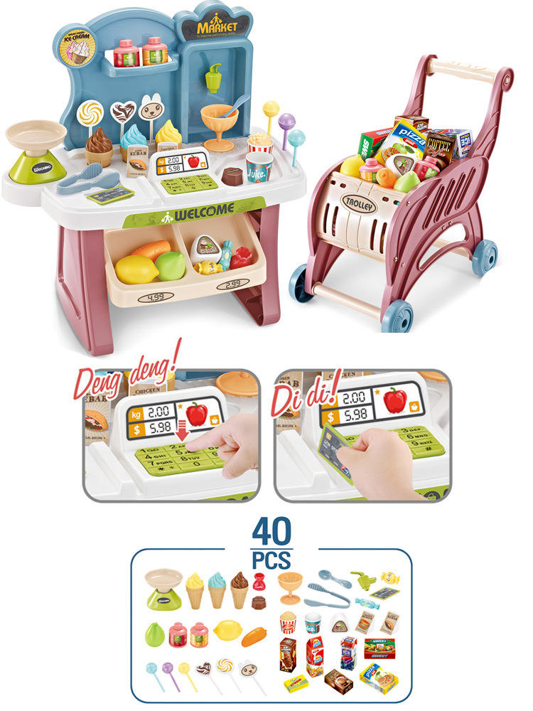 - Một bộ gồm: 1 xe đẩy + quầy bán kem siêu thị có âm thanh, đồ dùng mô phỏng thực phẩm đi kèm,